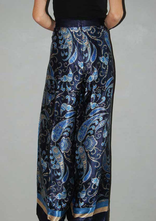 מכנסיים עם צורות בצבעי כחול בד מבריק, ריץ' קץ' בגב לסגירה