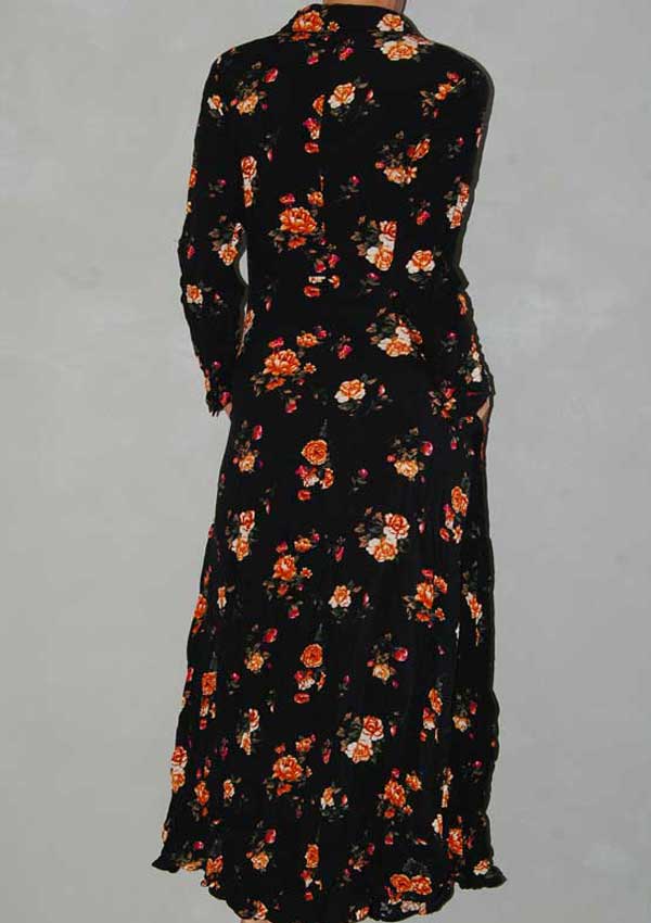 שמלת מקסי חמודה שחורה פרחונית עם כפתורים לאורך הקדימה וכיסים בצד