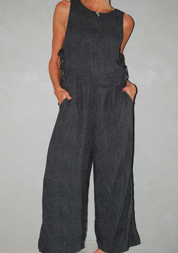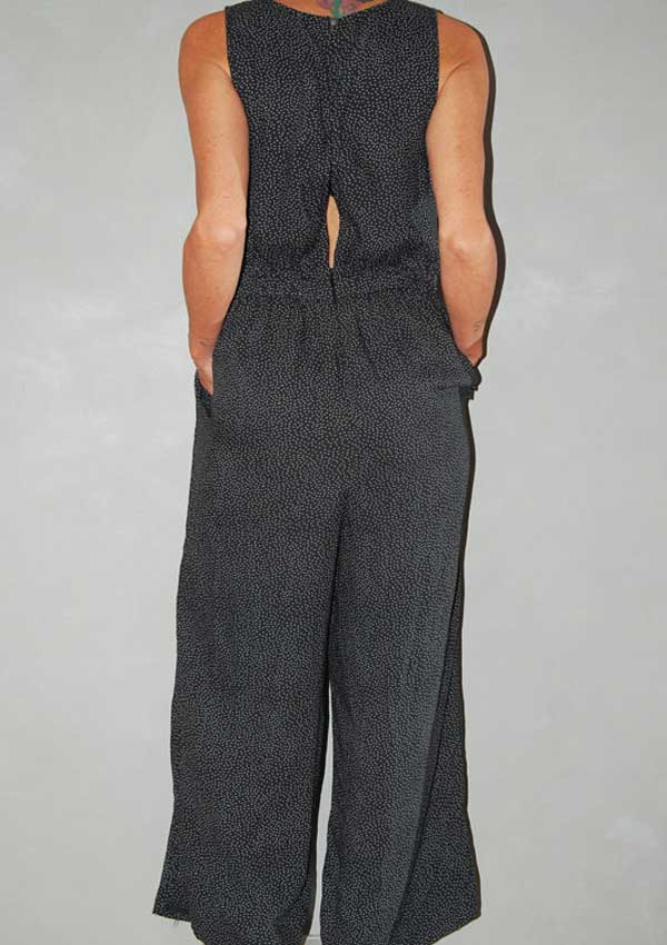 אוברול שווה בצבע שחור עם נקודות לבנות כיסים בצד קשירה בצד וריץ' רץ' בגב