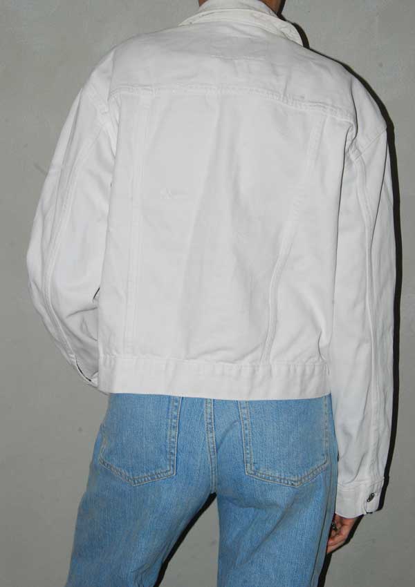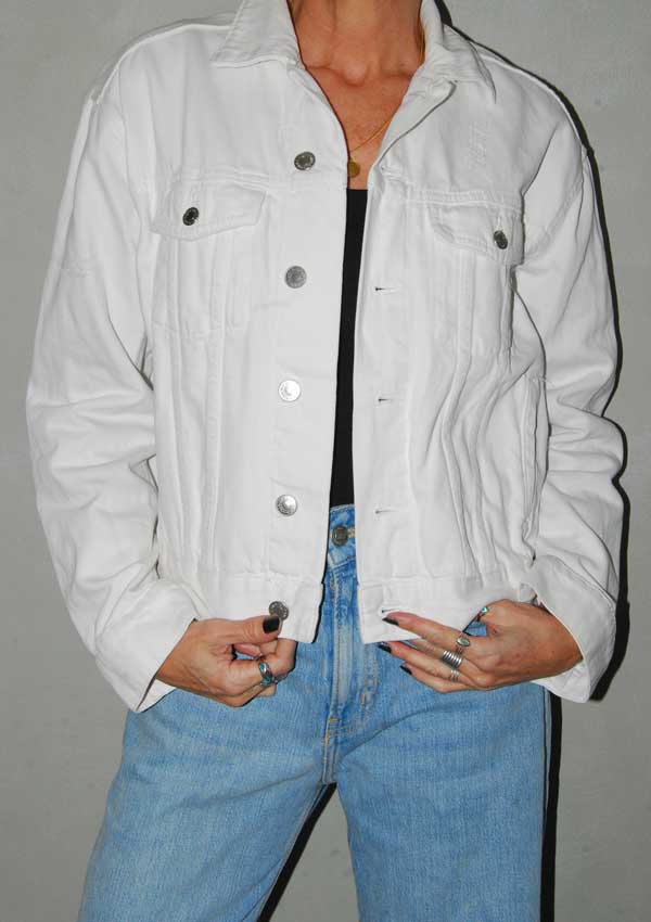 מעיל ג'ינס לבן מושלם, כיסים למעלה ובצד אין כתמים על הז'קט, מדובר בהבדלי צבע כתוצאה מהאור