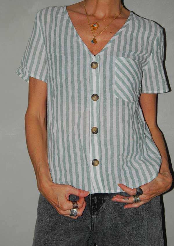 חולצת פסים לבן-ירוק עם כפתורים מקדימה