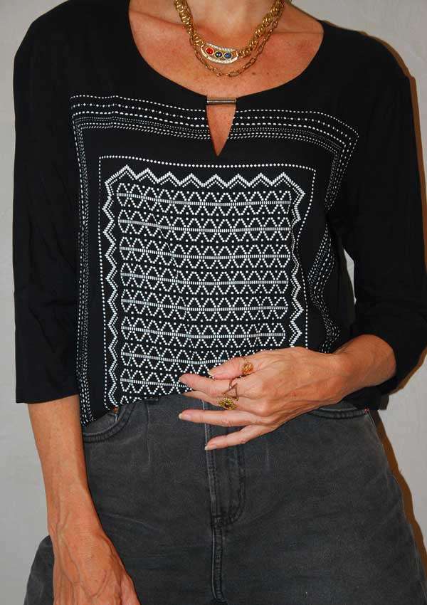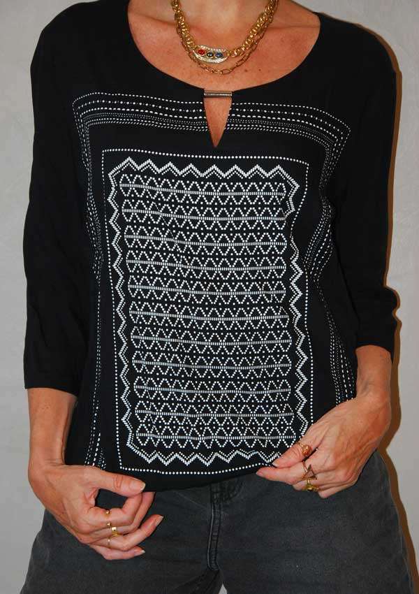 חולצה שחורה עם צורות לבנות גומי בחלק התחתון