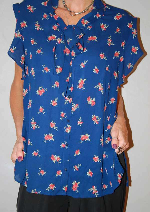 חולצה כחולה עם פרחים אדומים וקשירה בצוואר