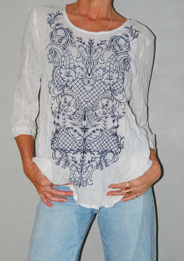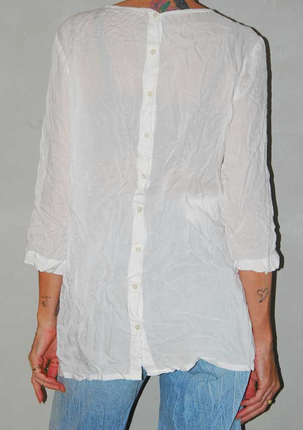 חולצה לבנה עם פרחים רקומים בצד וכפתורים בגב