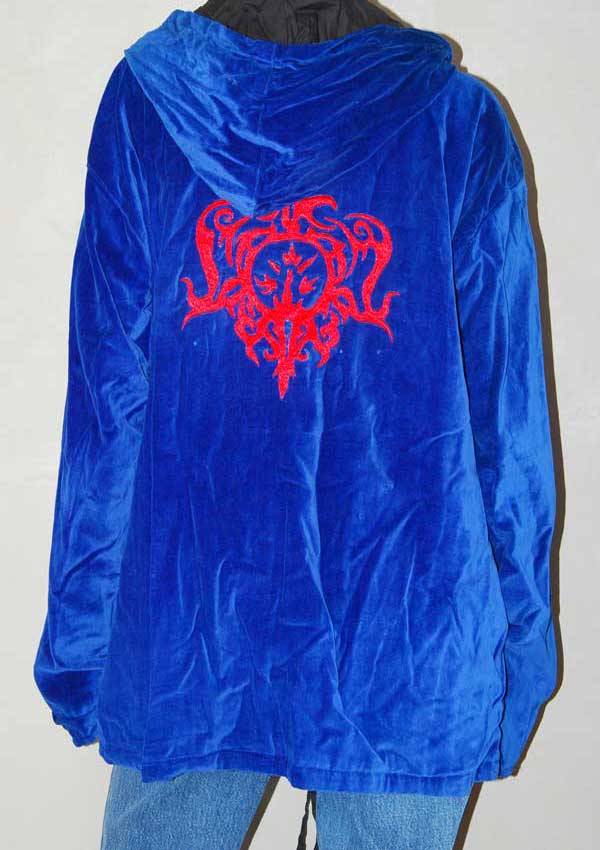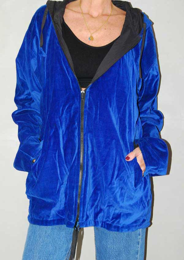 מעיל קטיפה בצבע כחול עם ריץ' רץ' לסגירה וקפוצ'ון עם צורה רקומה בגב