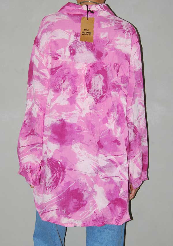 חולצה MADE IN ITALY חדשה עם טיקט בצבע ורוד עם ציורים ומריחות צבע של עלים וצורות, מכופתרת