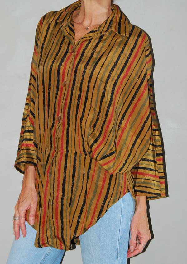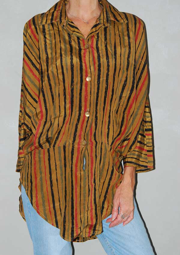 חולצת וינטג' מיוחדת בצבע חום עם פסים בצבע שחור, אדום, ירוק, כפתורים לאורך הקדימה