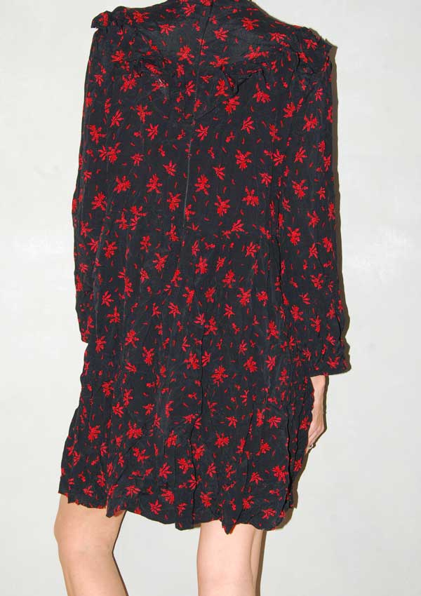שמלה בצבע שחור עם פרחים ועלים אדומים, ריץ' רץ' ארוך בגב לסגירה