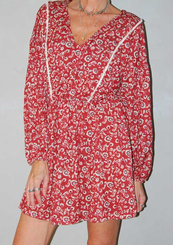 שמלת חמודה בצבע חמרה עם פרחים לבנים גומי במותן