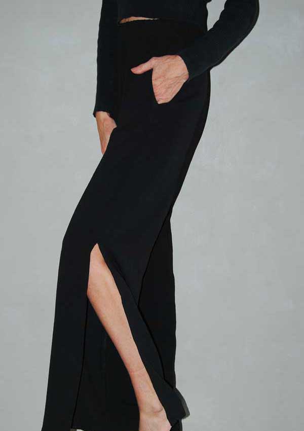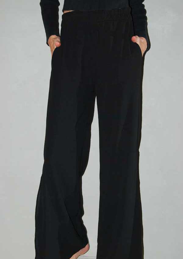 מכנסיים שחוריעם רחבים עם שסע בצדדים גומי דחלק עליון וכיסים בצד