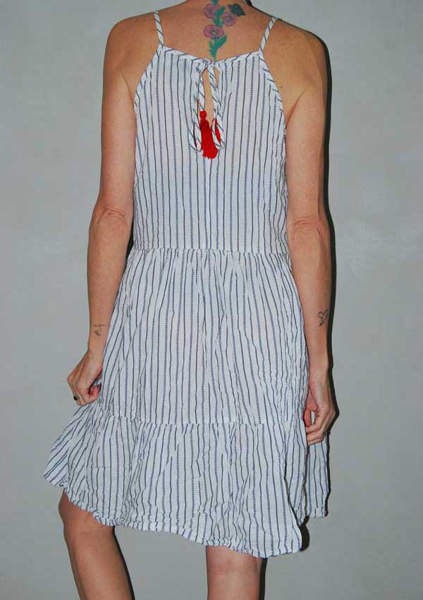 שמלת פסים רחבה עם כיסים מקדימה ותחרה קשירה בכתפיים