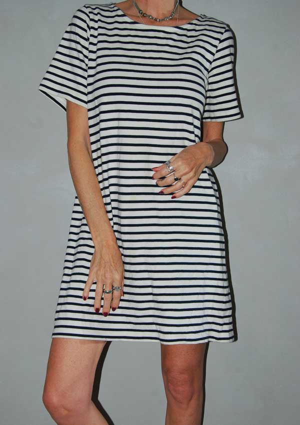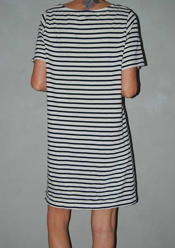 שמלת פסים שחורה עם פסים בצבע אדום-לבן-שחור עם כפתורים מקדימה וכיסים