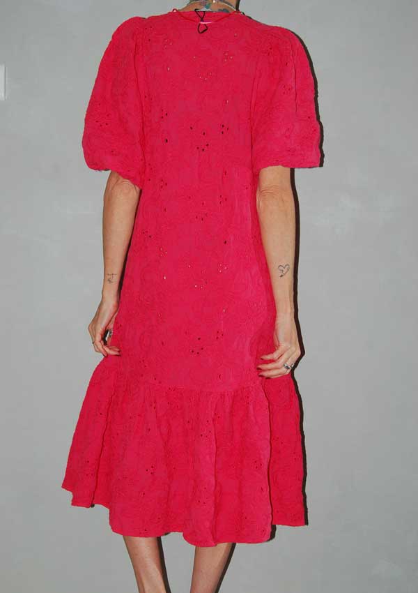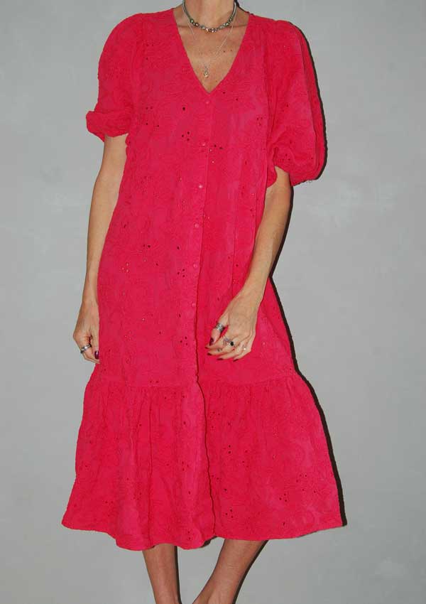 שמלה מהממת בצבע אדום-ורוד עם פרחים רקומים מוטבעים בשמלה וכפתורים חמודים לכל האורך סיומת פפלום