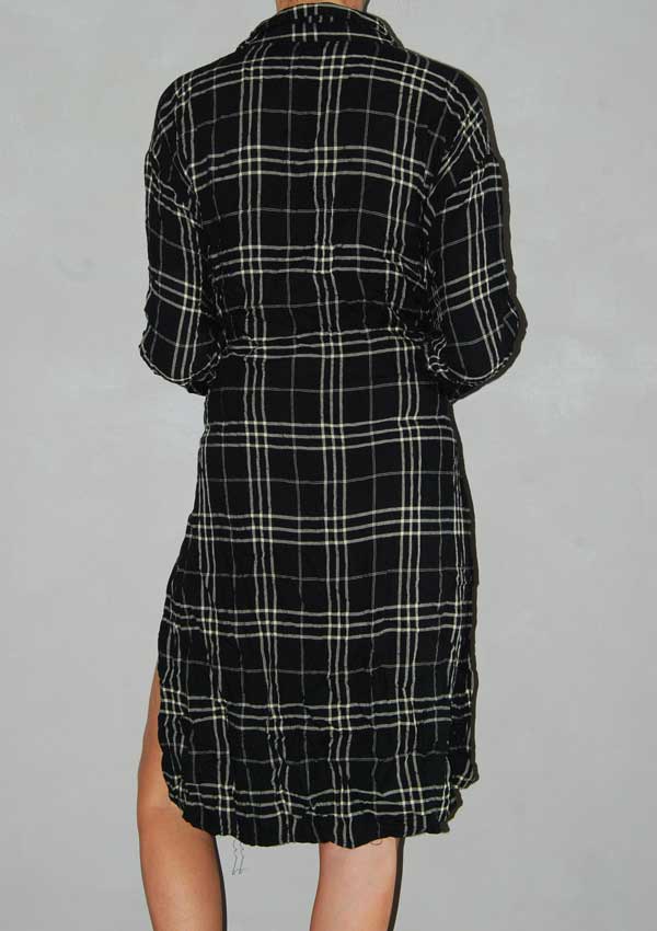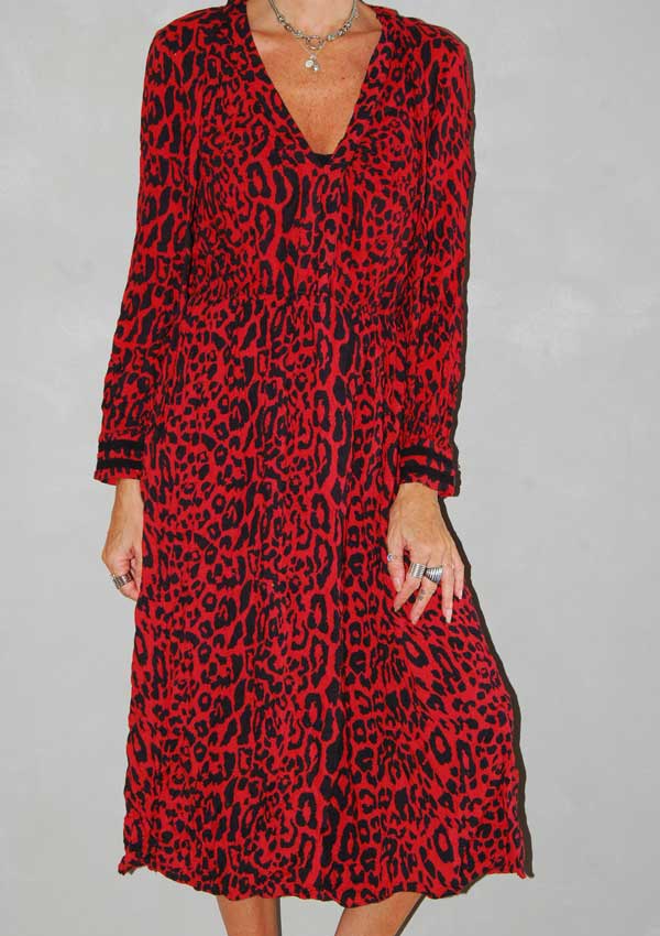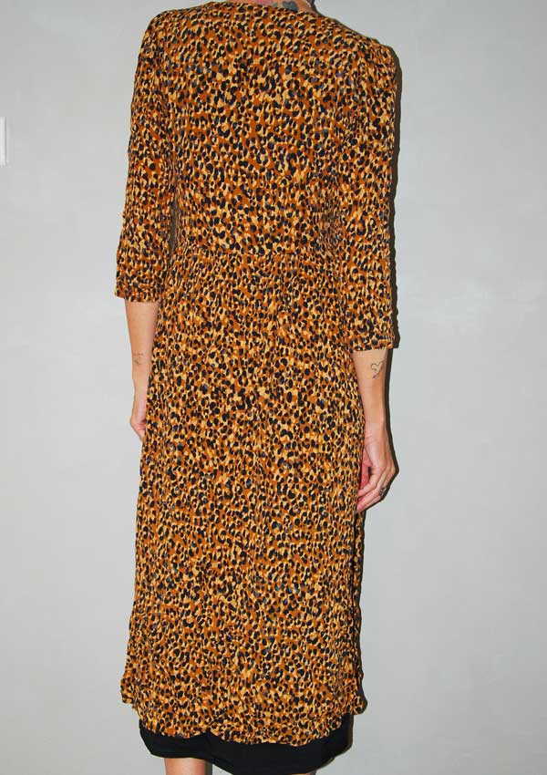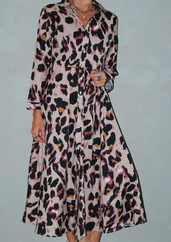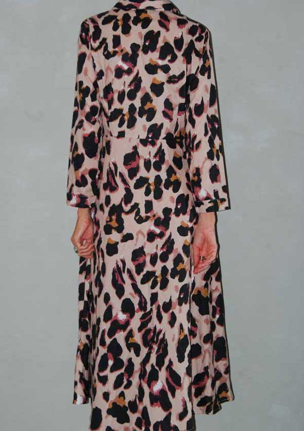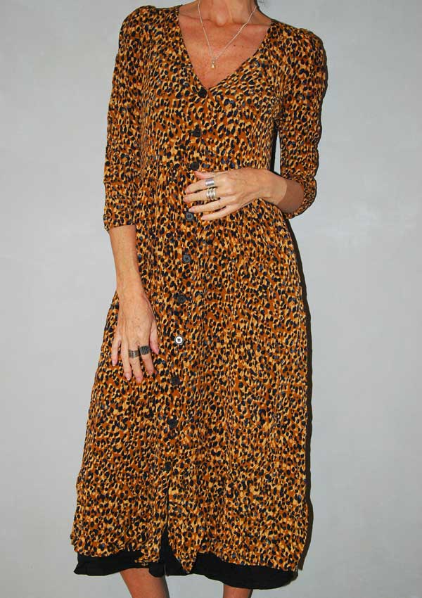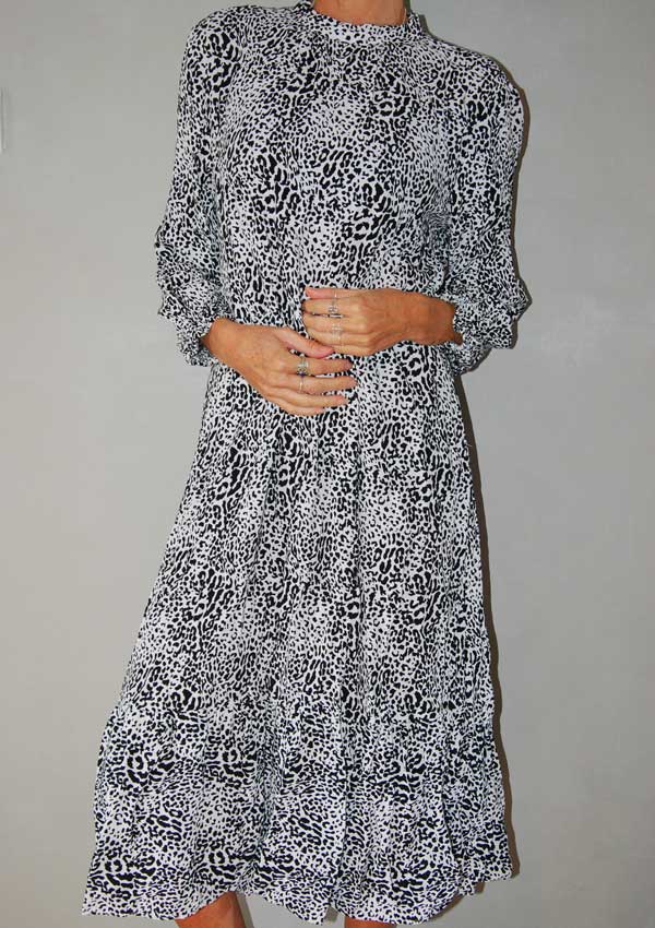 שמלה מנומרת שווה עם כפתורים לאורך הקדימה וכיסים בצד