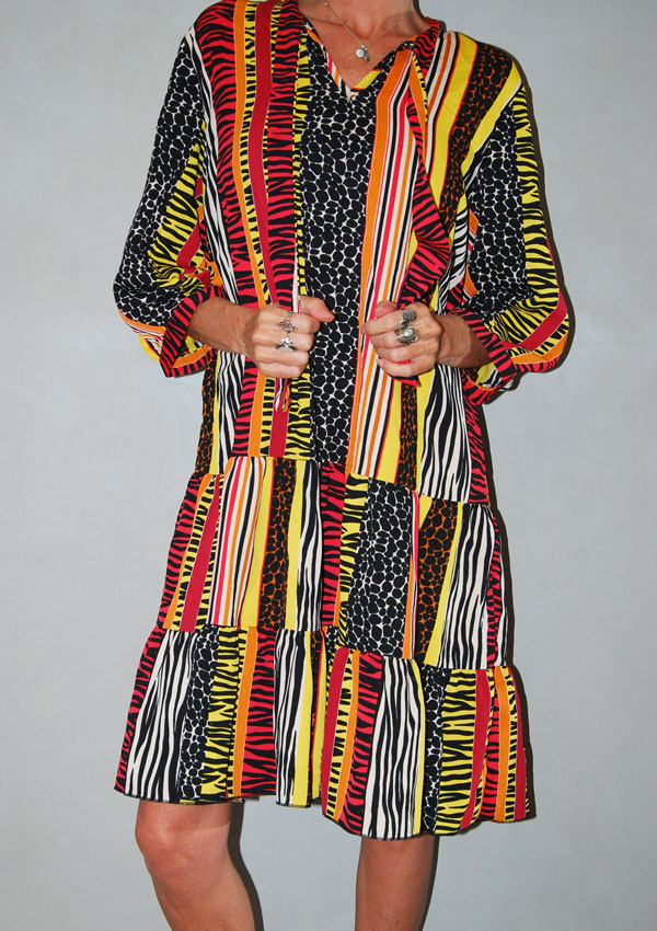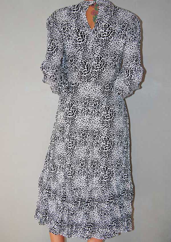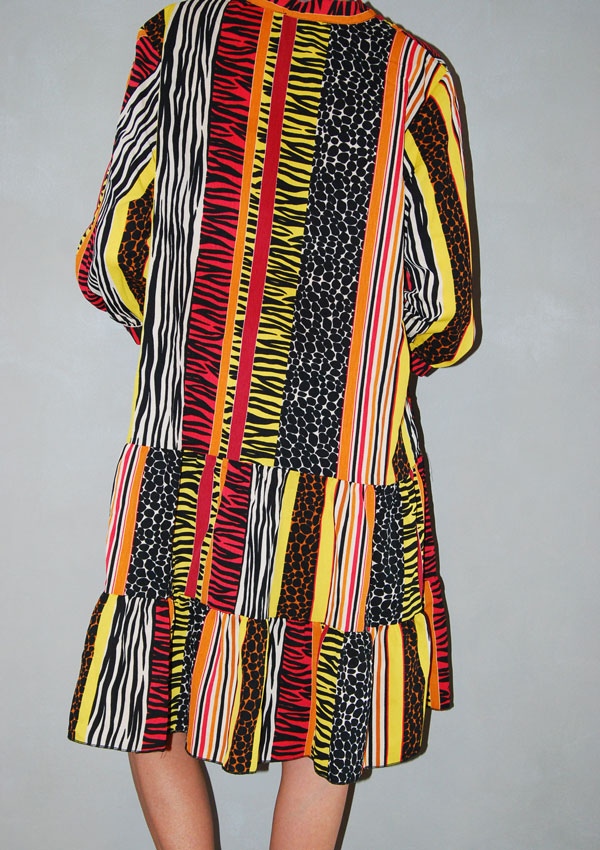 שמלה נמרית בצבעים טורקיז עם כתמים שחורים ולבנים כפתורים בחלק העליון חגורה מצורפת