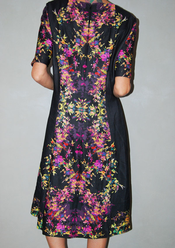 שמלה שחורה עם פרחים מצוירים באמצע השמלה ובצדדים ELI TAHARI ריץ' רץ' בגב מידה רשומה 12 - אך תהיה טובה למידות M