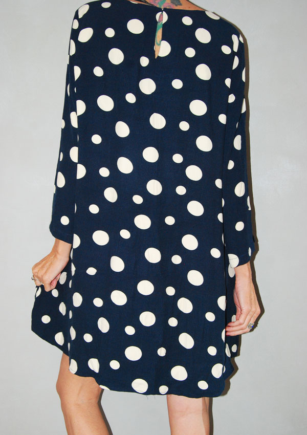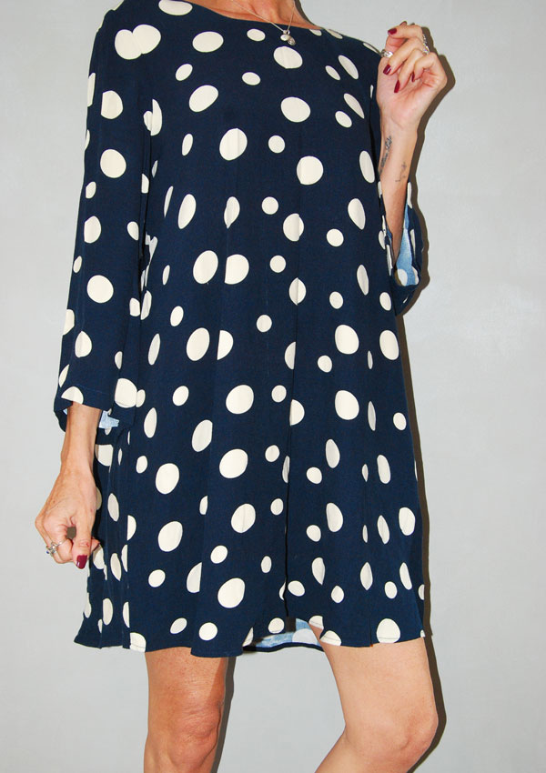 שמלה בצבע כחול כהה עם נקודות לבנות גדולות, גזרה OVERSIZE חמודה