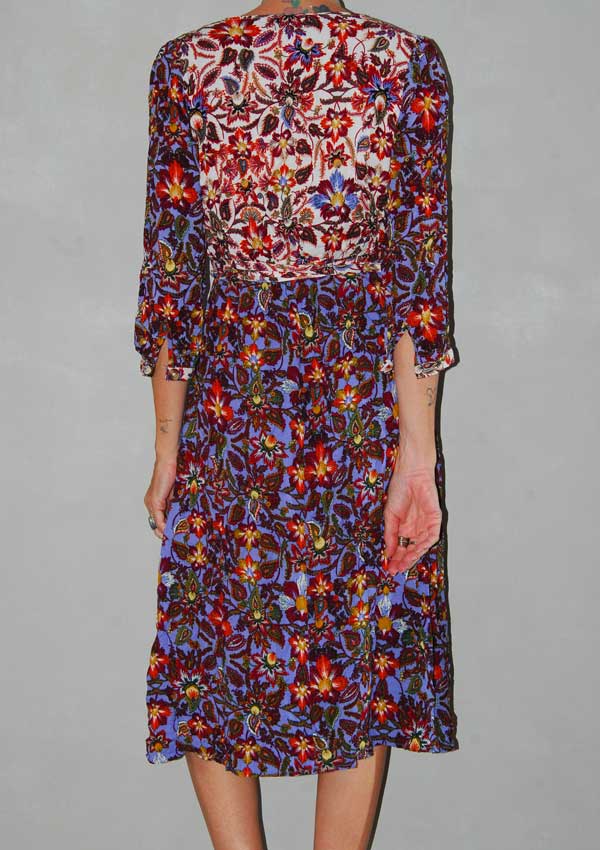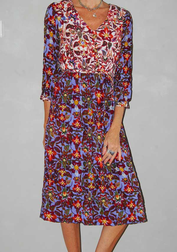 שמלת פשתן חמודה עם פרחים ועלים בצבעי בורדו כחול לבן וחום כיסים מקדימה