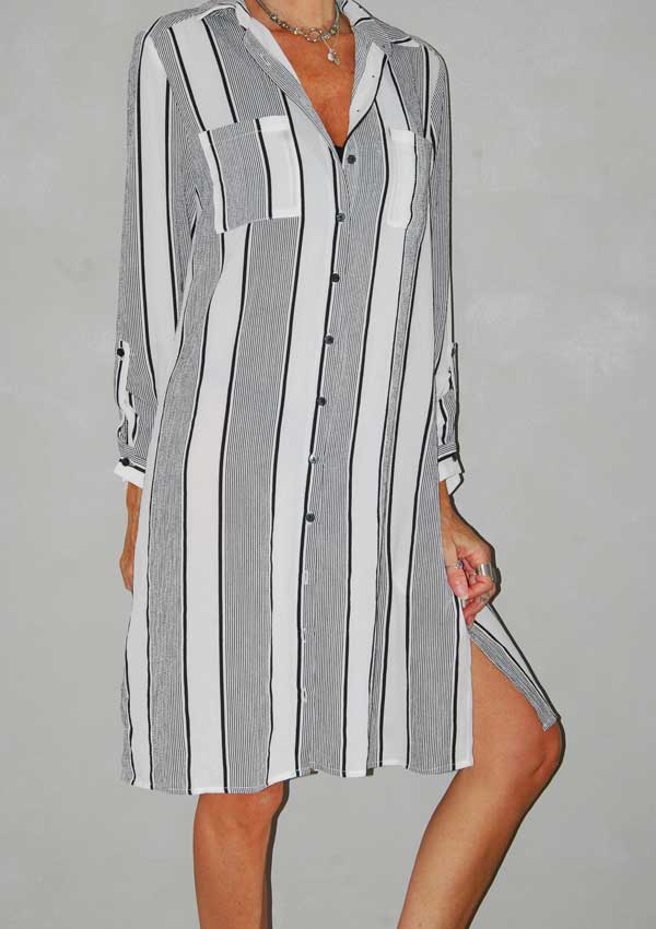שמלת פסים חמודה ממש עם כפתורים לאורך הקדימה וכיסים מקדימה חדשה עם טיקט