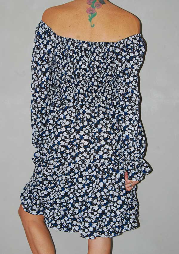 שמלה פרחטנית חמודה עם כפתורים מקדימה בחלק העליון וגומי עבה מתחת לחזה הדוגמנית לובשת גוזיה מתחת לשמלה, זה לא חלק מהשמלה