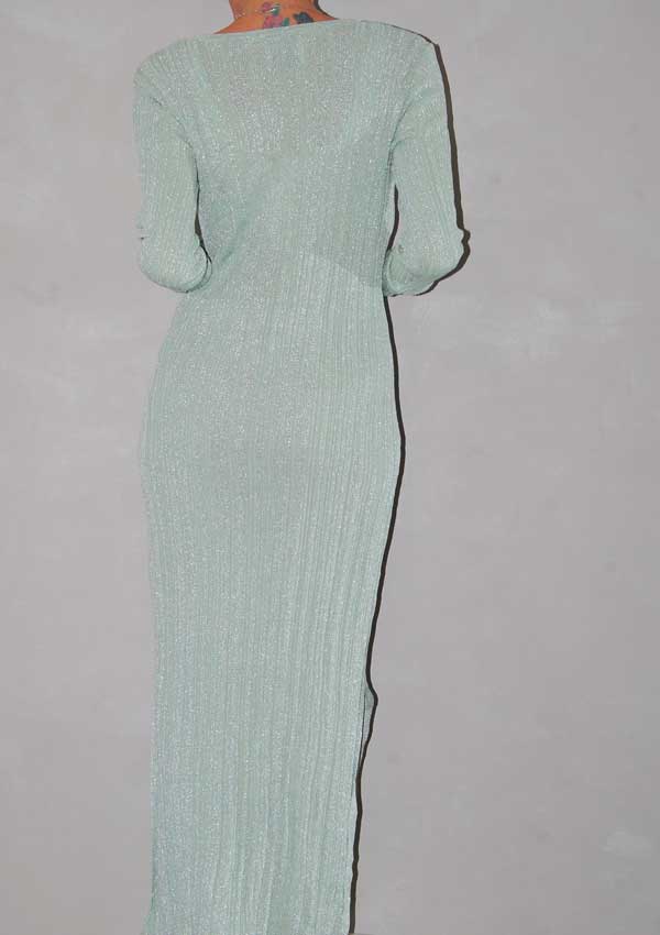 שמלה בצבע ירוק משגע עם נקודות שחורות ושסע שווה מקדימה כפתורים מקדימה וגומי מתחת לחזה