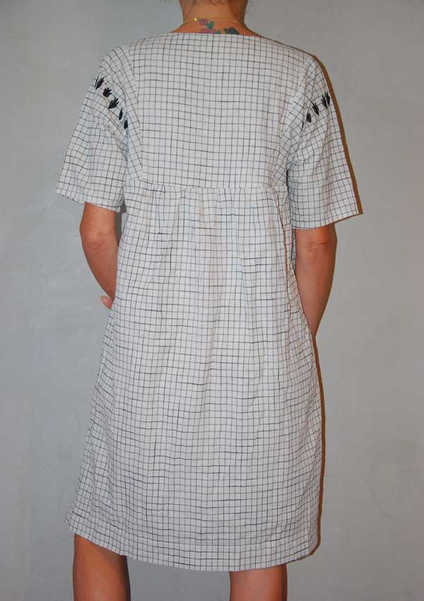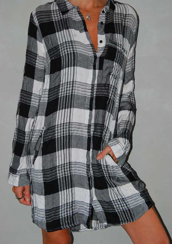 שמלה משובצת שחור-לבן עם כפתורים לאורך הקדימה וכיסים בצד