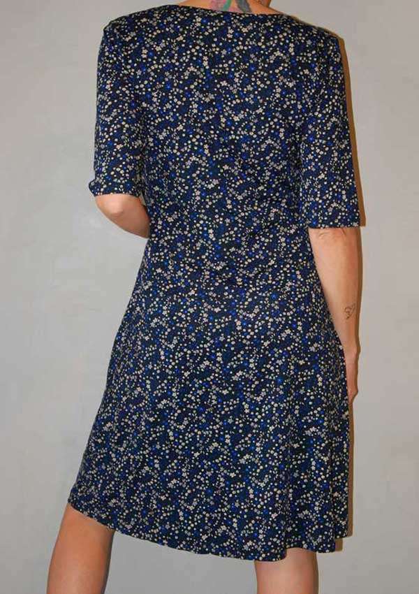 שמלה חמודה בצבע כחול כהה עם פרחים קטנים בצבעי לבן שחור אפור כחול