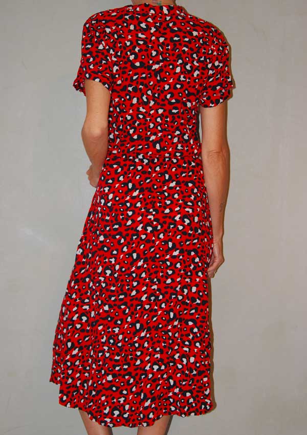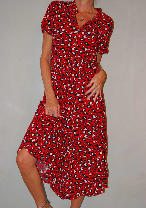 שמלה מנומרת אדומה שחורה לבנה עם כפתורים מקדימה וקשירה במותן
