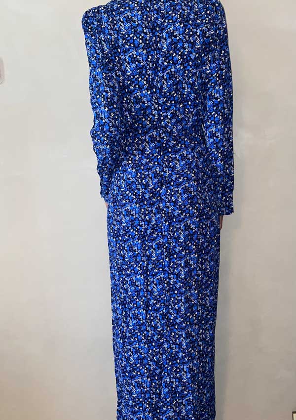 שמלת מקסי כחולה עם פרחים קטנים לבנים וכחולים ריץ' רץ' ארוך בגב