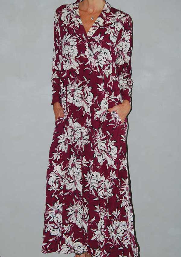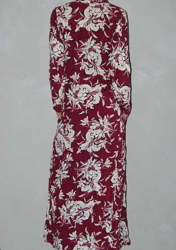 שלת מקסי בצבע בורדו עם פרחים גדולים וכיסים בצד
