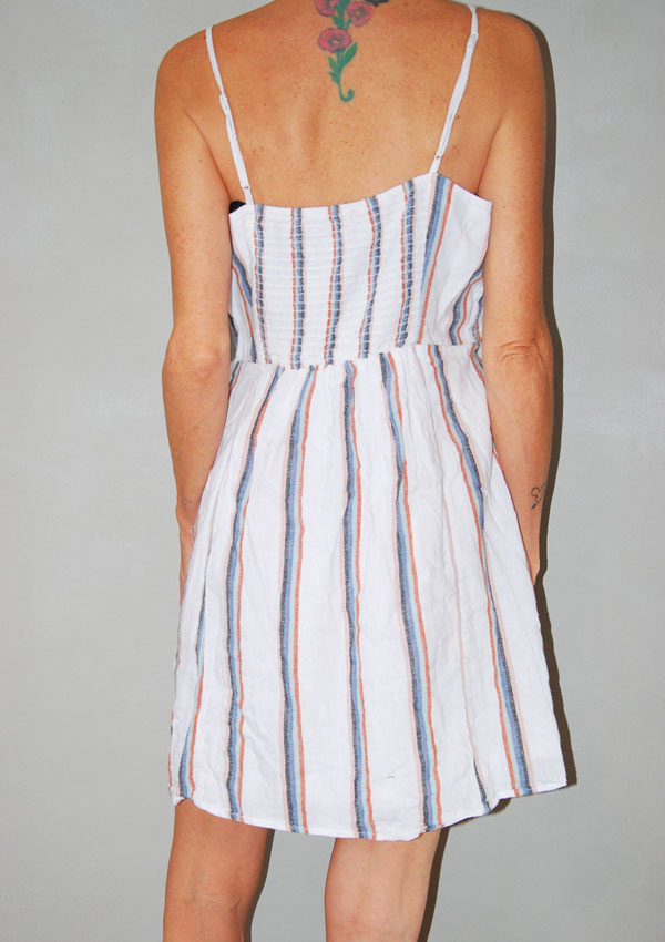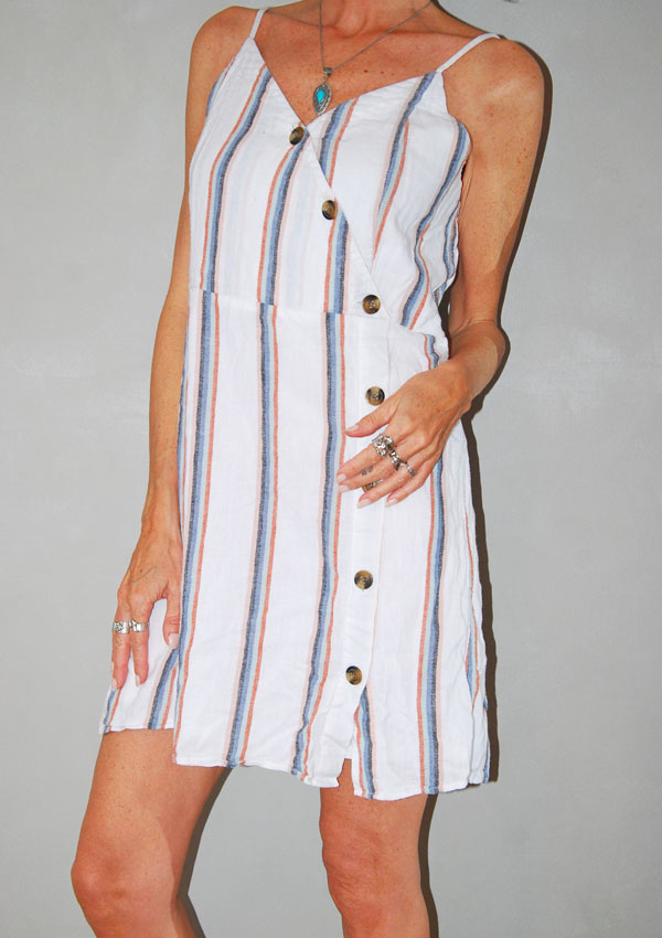 שמלה קיצית מושלמת לבנה עם פסים בצבעים שונים כפתורים מקדימה גומי בגב כתפיות מתכווננות