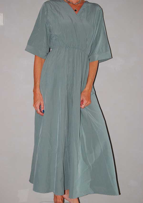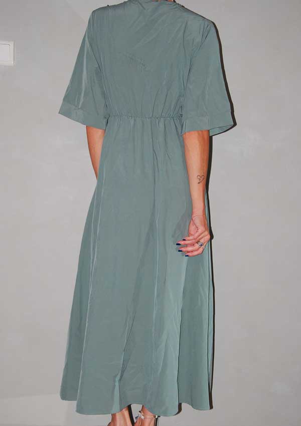 שמלת מקסי מחמיאה בצבע מנטה-חאקי גומי במותן