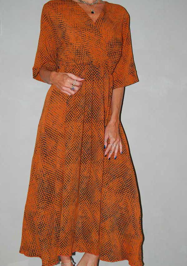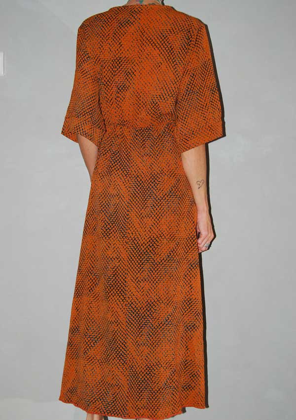 שמלת מעטפת בצבע כתום עם פרחים וענפים וכתמי בורדו
