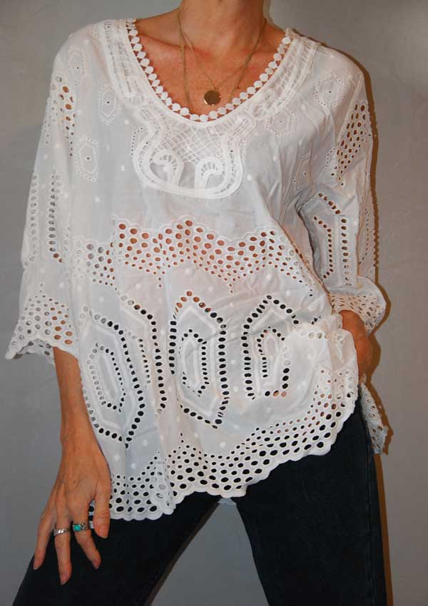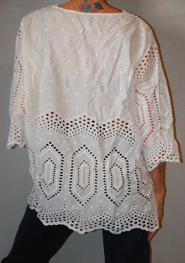 חולצה לבנה עם צורות רקומות וגומי בכתפיים