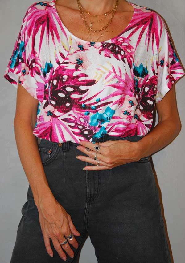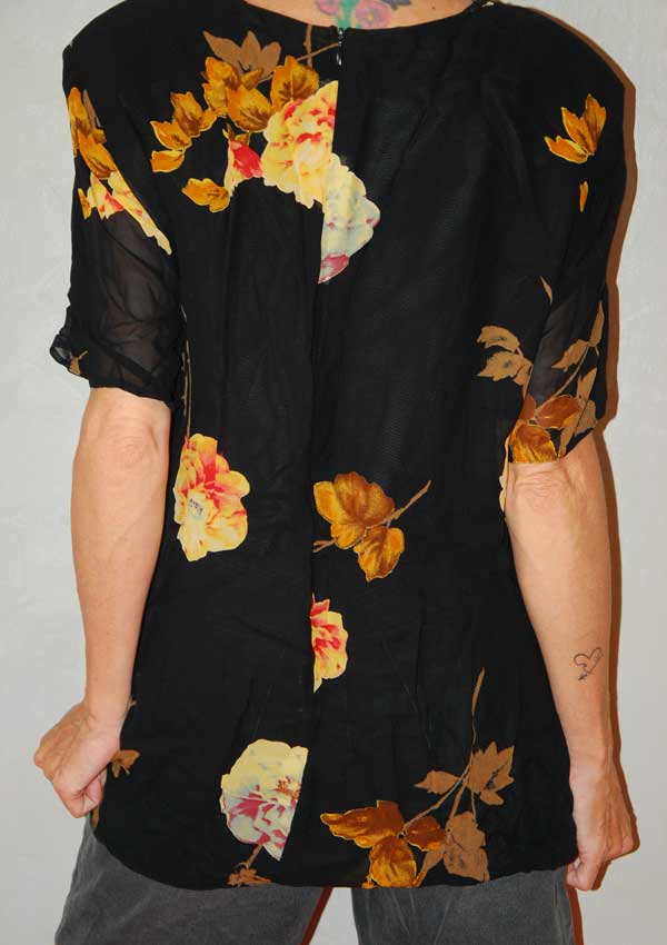 חולצת וינטג' פרחונית משנות ה-90, קשירה בצד, ריץ' רץ' בגב כריות בכתפיים