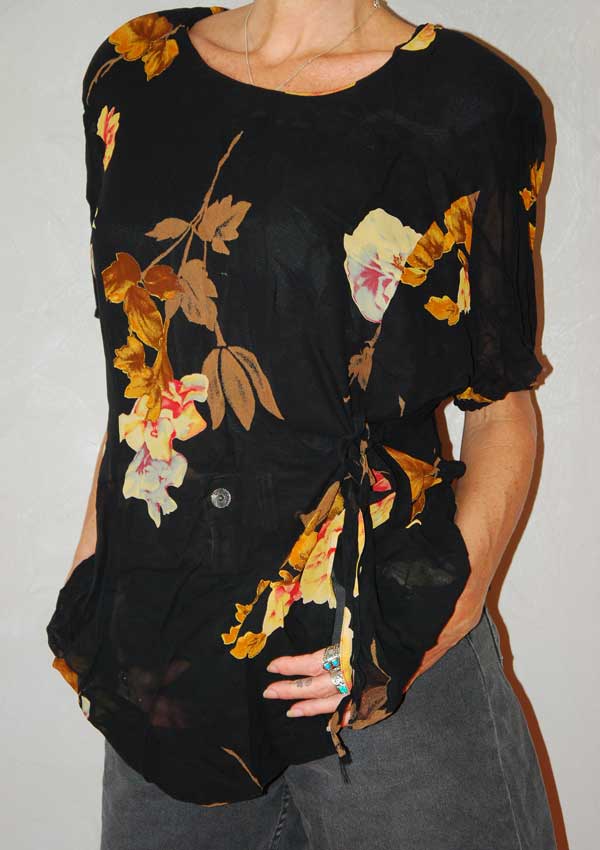 חולצה שחורה עם פרחים ורודים אדומים לבנים קשירה לאורך הקדימה וסיומת פפלום