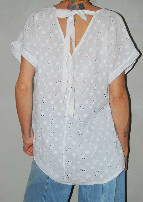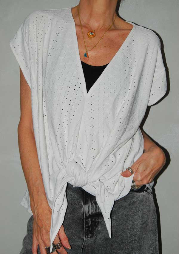 חולצה לבנה עם חורים קטנים וקשירה מקדימה, תהיה טובה למידות M-XL
