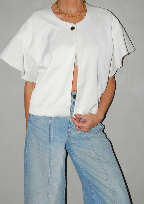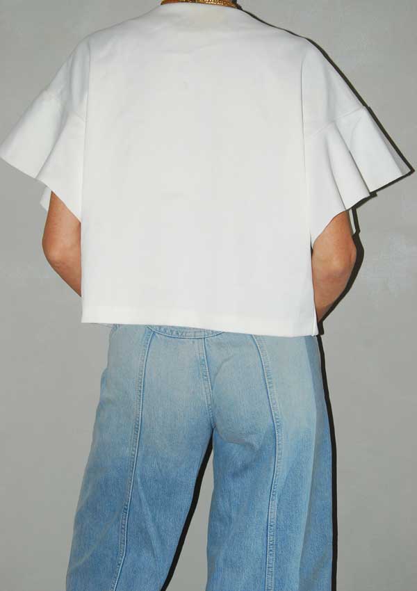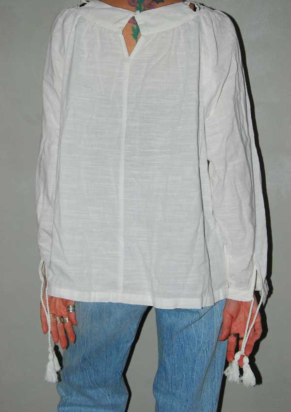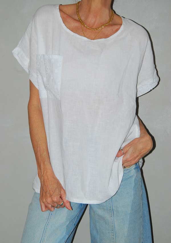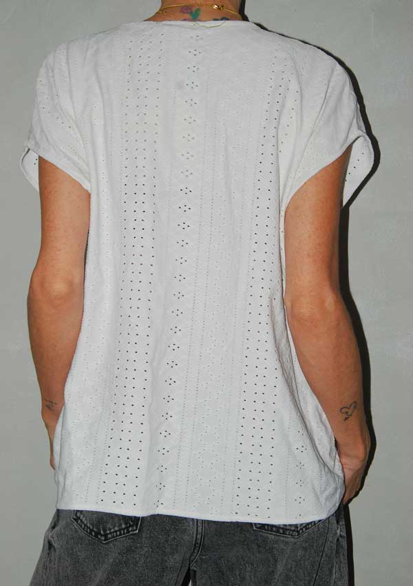 חולצה לבנה יפה עם חיתוכים מקדימה (דוגמנית לובשת מתחת גופיה שחורה) SACK'S