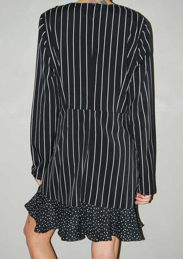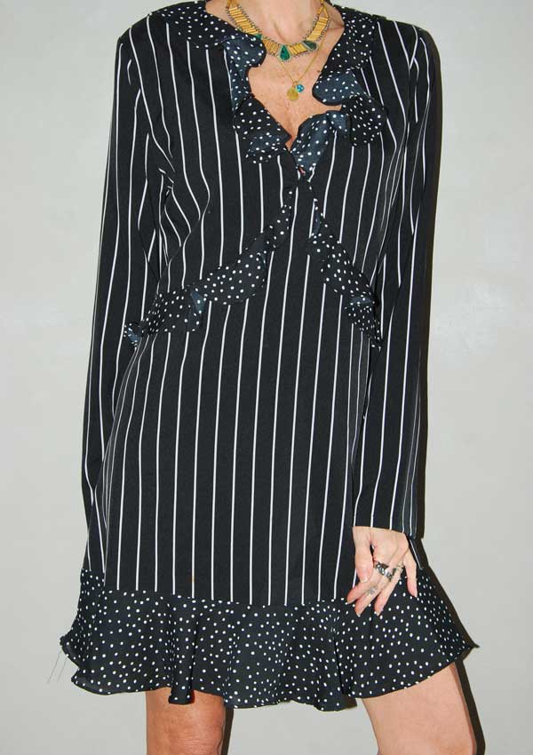 שמלה חמודה פסים שחור-לבן ונקודות בצווארון ובסוף השמלה