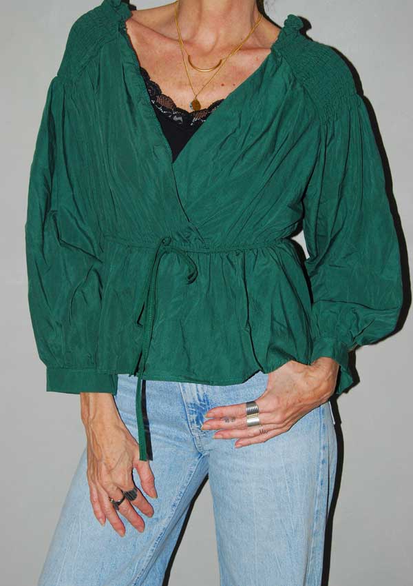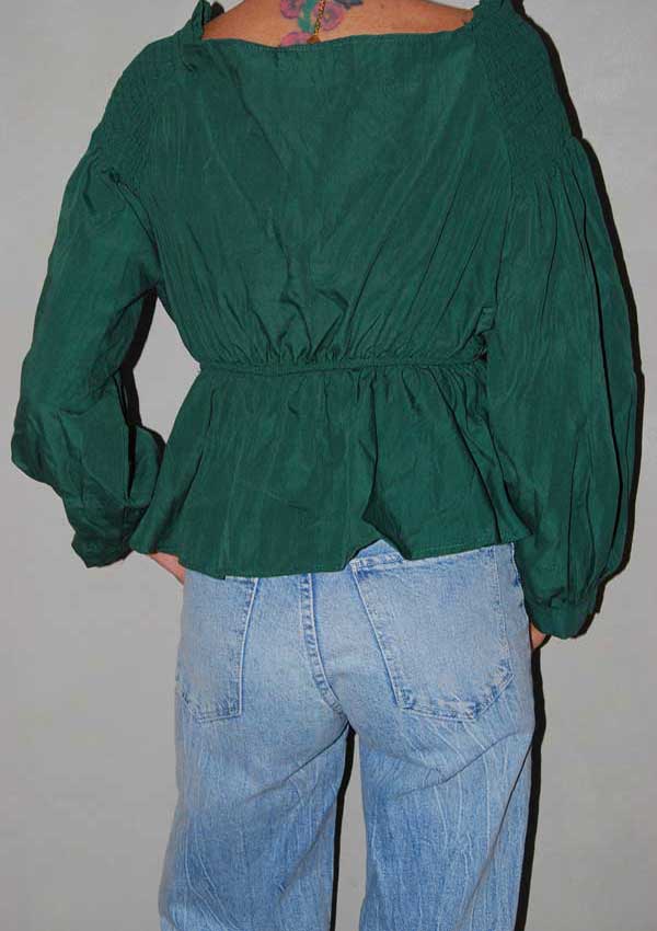 חולצה ירוקה מיוחדת עם פתח רחב מקדימה גומי וקשירה במותן