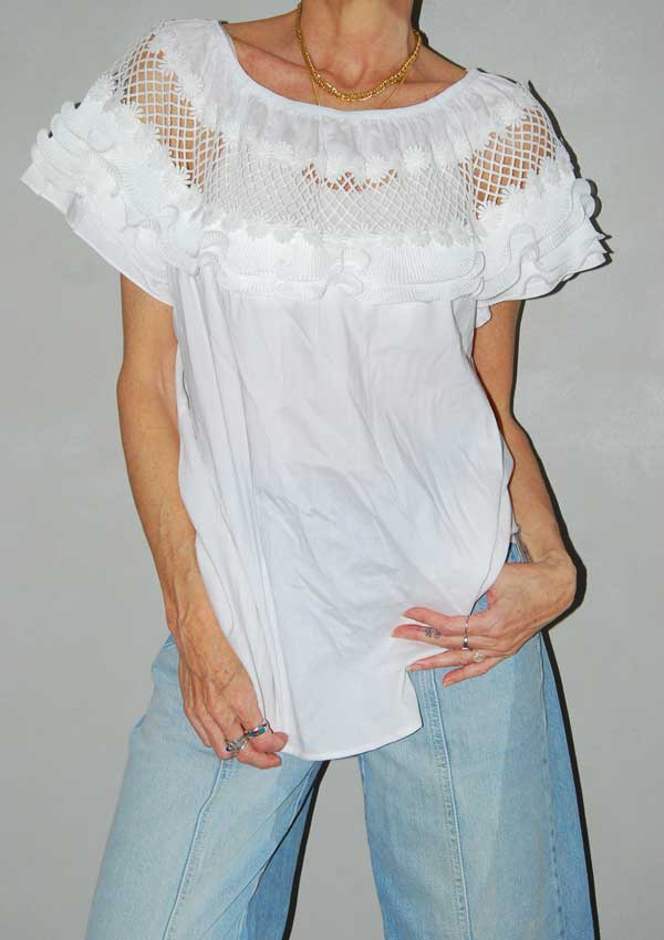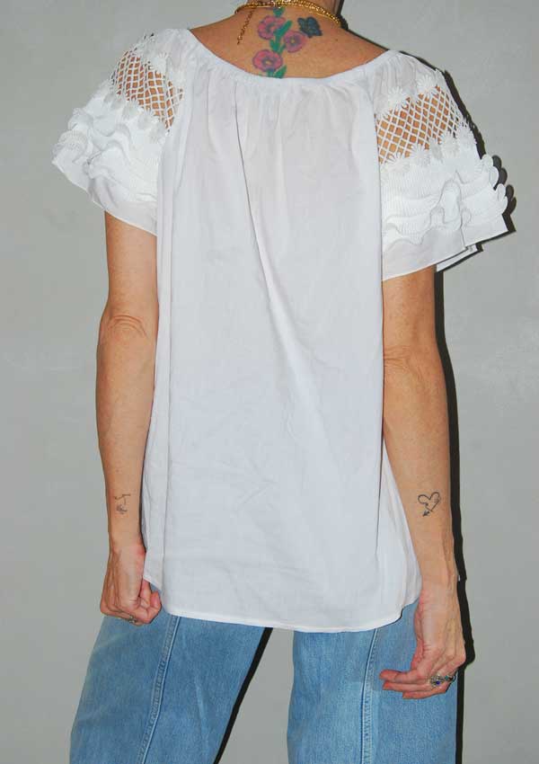 חולצה לבנה עם גומי בכתפיים ופרחים
