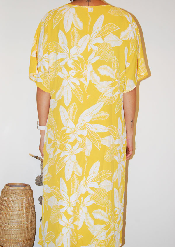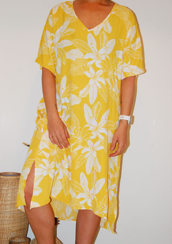 שמלה קיצית וכיפית בצבע צהוב עם ציורים של פרחים גדולים