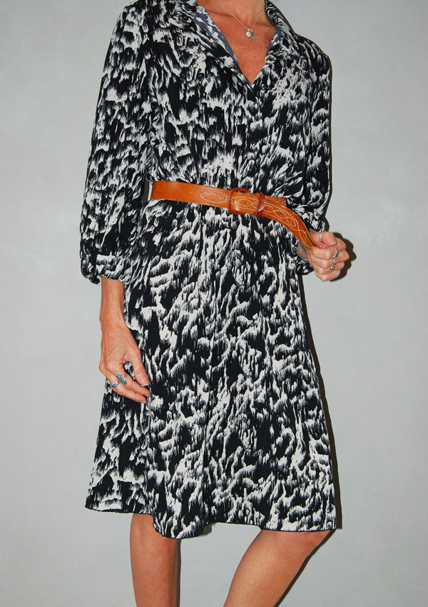 שמלה נמרית בצבעים טורקיז עם כתמים שחורים ולבנים כפתורים בחלק העליון חגורה מצורפת