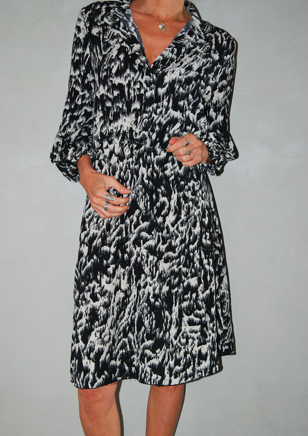 שמלה מנומרת שווה עם כפתורים לאורך הקדימה וכיסים בצד