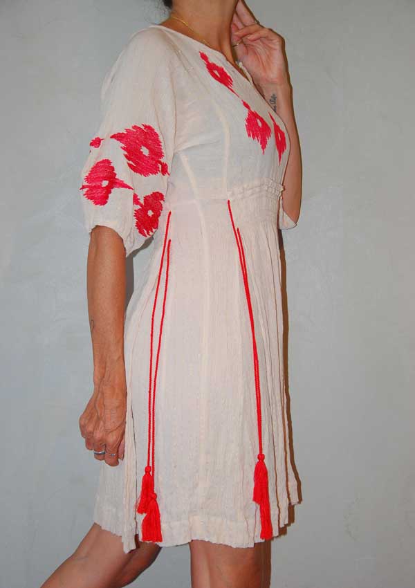 שמלה מיוחדת בצבע קרם עם צורות רקומות אדומות וקשירה בצדדים