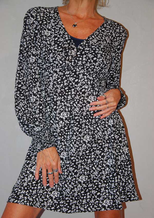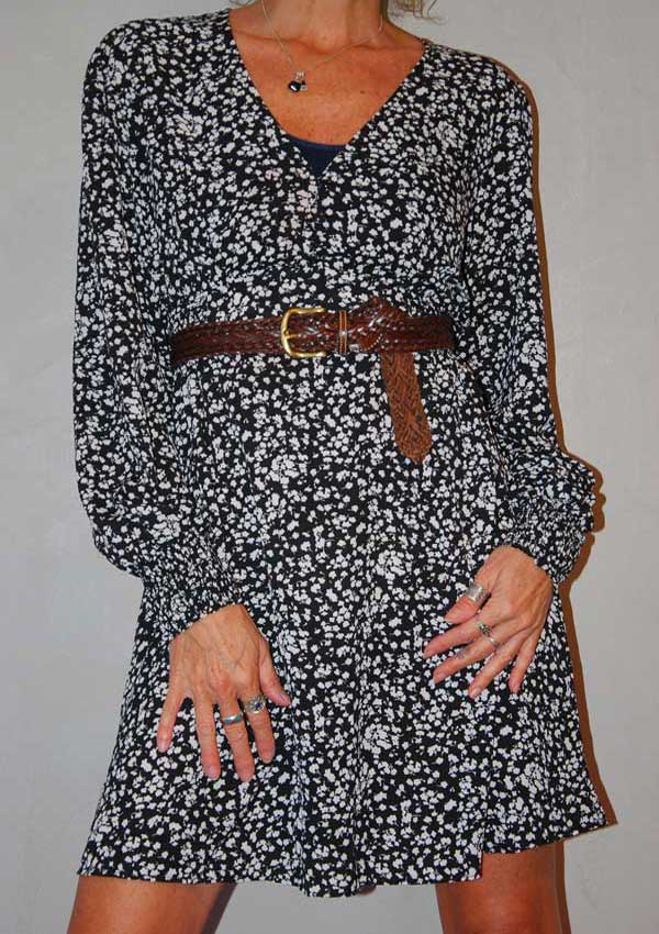 שמלה שחורה עם פרחים קטנים לבנים גומי מתחת למותן כפתורים קטנים בחלק העליון
