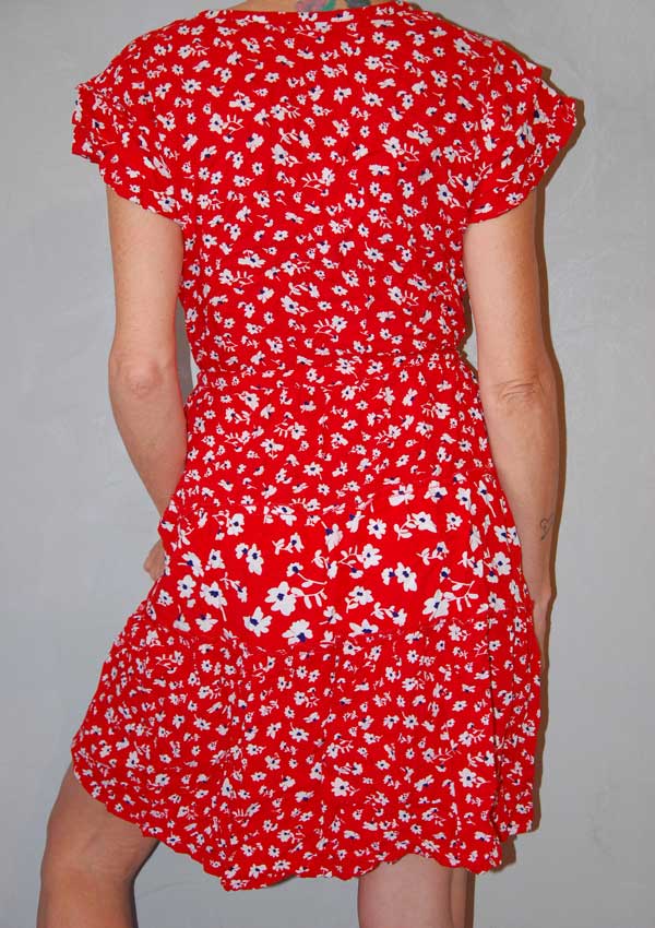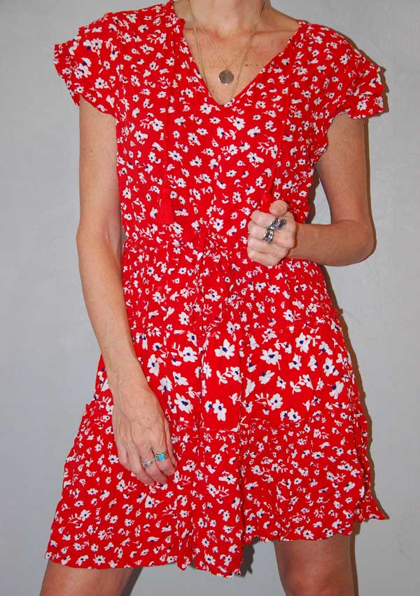 שמלה אדומה מושלמת עם פרחים לבנים קטנים וקשירה חמודה בצוואר רנואר