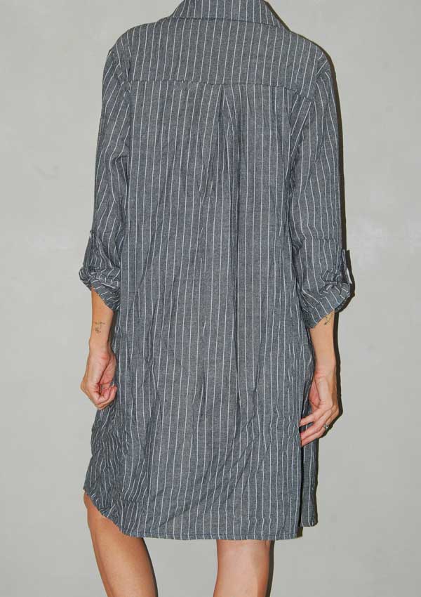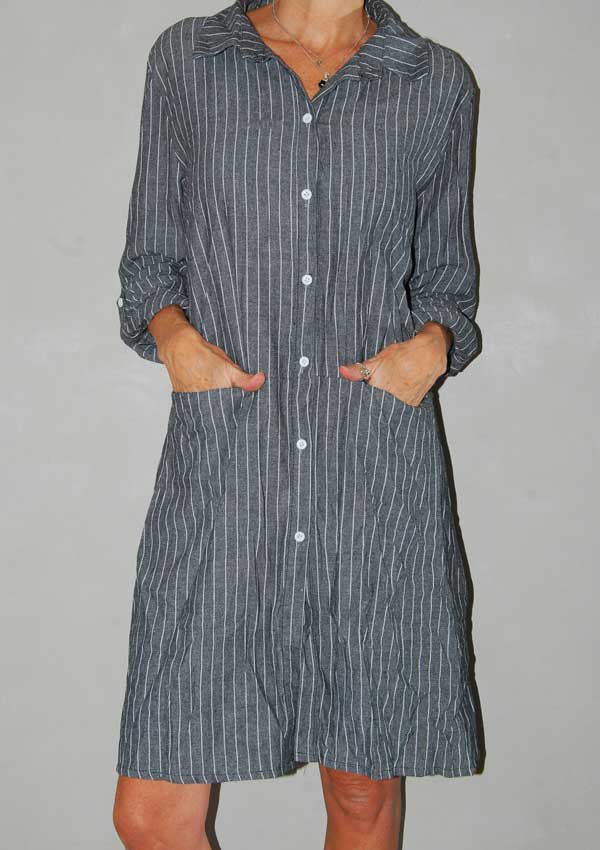 שמלה אפורה עם פסים לבנים, כיסים מקדימה וכפתורים לאורך השמלה