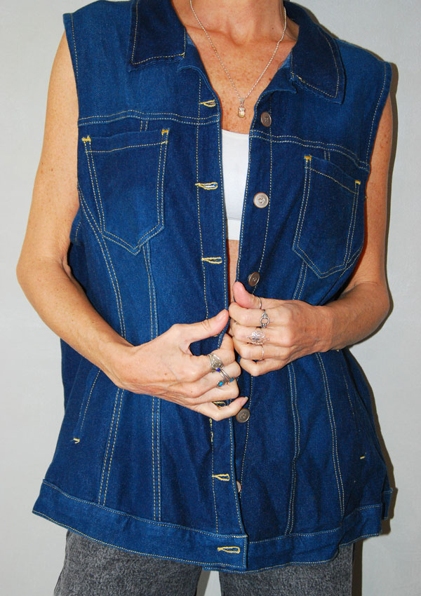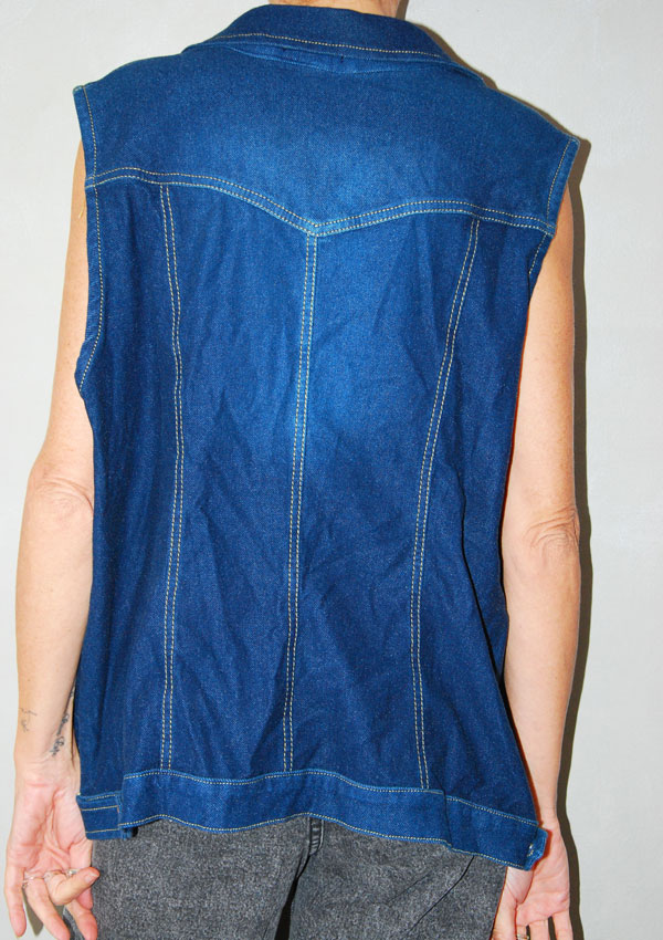 ווסט ג'ינס כהה עם כפתורים מקדימה וכיסים בצד. מידה גדולה אך יהיה מגניבה לכל מידה מעל כל דבר
