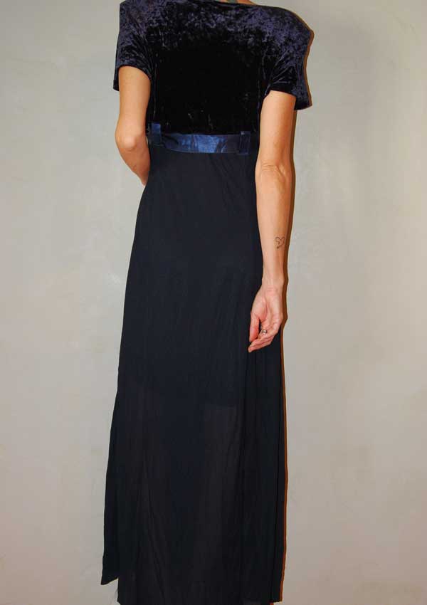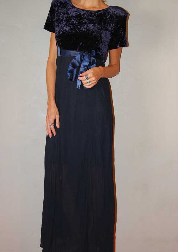שמלה בצבע כחול כהה מקסי ואלגנטית משנות ה-90 כמו שרק דורין פרנקפורט יודעת לעשות קשירה במותן קטיפה בחלק העליון